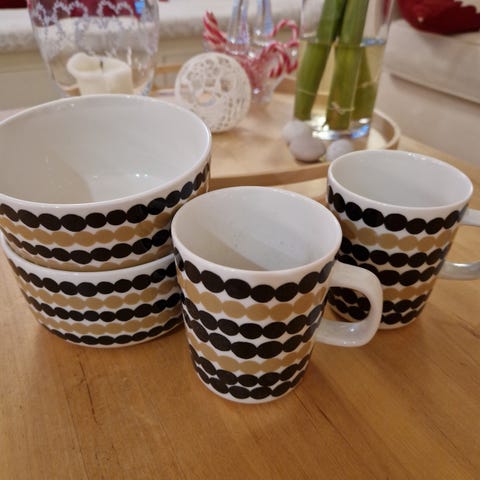 Beige Marimekko Siirtolapuutarha muki räsymatto kuviolla. Kahva särkynyt, mutta palaset tallella, joten voi vielä mahdollisesti korjata! Tai sitten mukille voi keksiä jonkin uuden käyttötarkotuksen😄