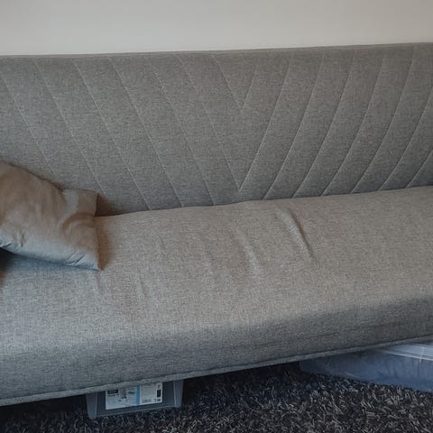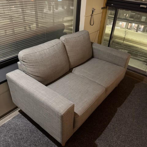 Selling a grey Egense sofa from Jysk that seats 2 people. Cat has made it's mark on the armrests and there are two spots with blue tack. Width 142 x height 80 x depth 80 cm. Asking for 20€, offer!