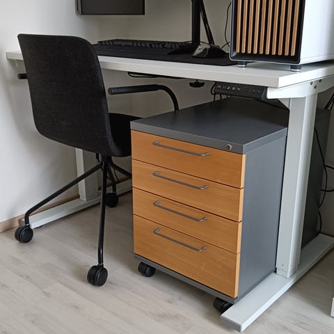 Kolme vetolaatikkoa metallisessa laatikostossa. Lukittavissa.