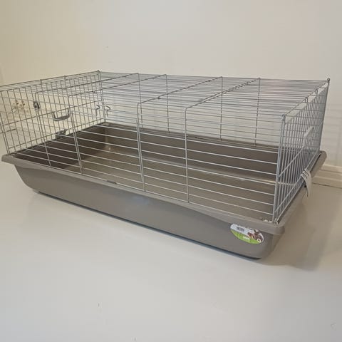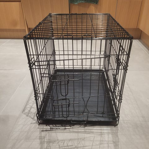 Metallinen koiran/ lemmikin häkki, jossa on metalliverkko ja kahdella ovella varustettu rakenne. Sopii koirien kuljetukseen ja pitoon sisätiloissa. Korkeus 1 m, leveys 1,2 m