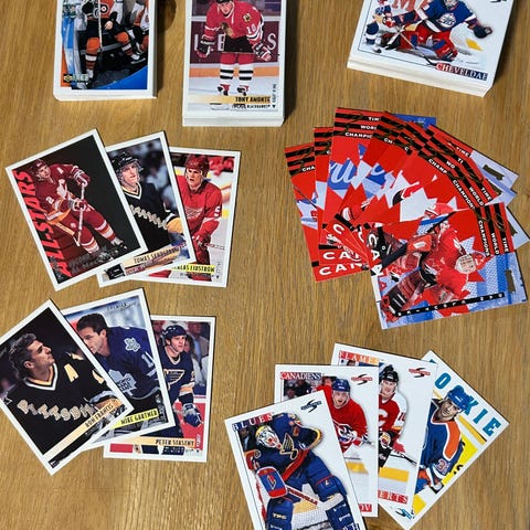 Jääkiekkokortit n. 250kpl. Lienee vähän yli, mutta joku tupla voi myös olla eksynyt mukaan.