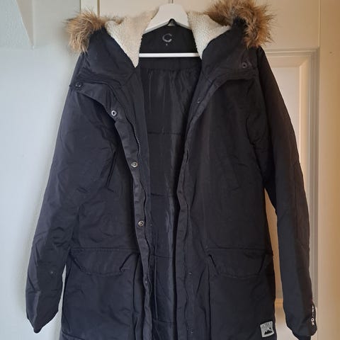 Nyt lähtee halvalla uusi paksu ja lämmin musta talvitakki hupulla, täysin vuorattu, edessä taskut / Koko: S, pituus n. 63cm / Materiaali: 100% polyesteri
