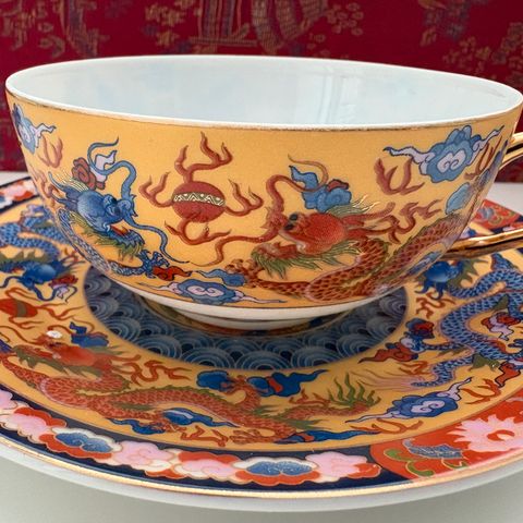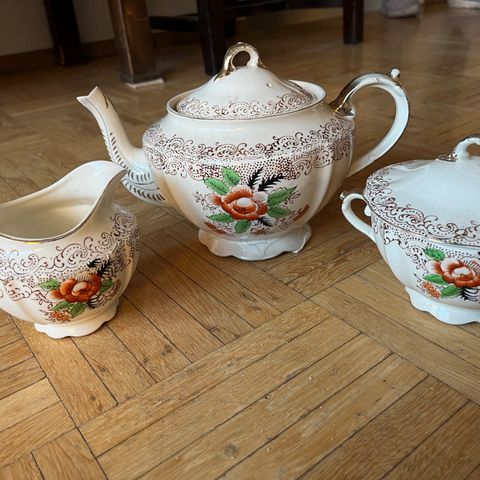 Teeastiasto: 4 kpl kuppi + lautanen + kakkulautanen, sokerikko, kermakko, pieni teekannu, iso teekannu (korva liimattu).