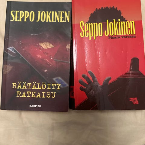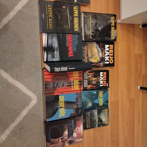Kokoelma kirjoja, joissa mukana teokset kirjoittajilta Seppo Jokinen ja Reijo Mäki. Kirjat ovat suomenkielisiä ja sisältävät rikos- ja jännityskirjallisuutta.