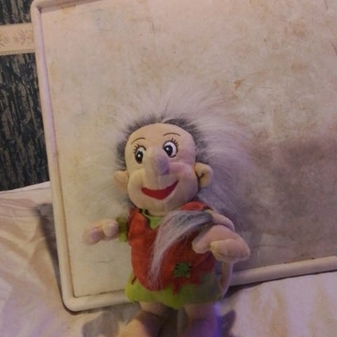 Kuvan vanha lelu. Jalat liikkuvat, kun rulla pyörii. Toinen jalka irti, ja kädet puuttuvat. Rullan kyljet aukeavat kun rullaa, mutta paikallaan ollessa pysyvät paikoillaan