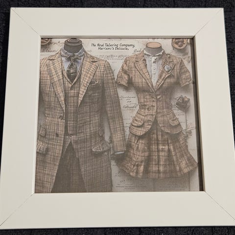 Kuvassa aiheena ompelimo / räätäli / asut sekä herkkukaupan / leipomon tuotteita.