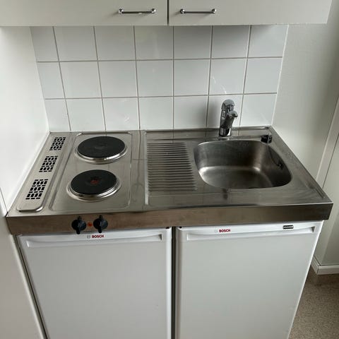 Todella pienellä käytöllä ollut minikeittiö jossa liesi,jääkaappi ,allas ja hana.etupäässä allas ollut käytössä.