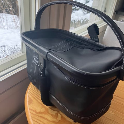Erittäin siistissä kunnossa. Sivukorissa on sisällä vetoketjullinen iso tasku. Korin sisällä lisäksi molemmissa päädyissä avoimet taskut ja kaksi helposti irrotettavaa väliseinämää. Sivukorin kannen saa kiinni vetoketjulla tai kokonaan irti.