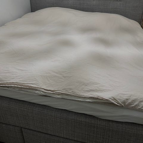 Sänky on siisti ja täysin tahraton. Patjansuojus voidaan pestä koneessa, ja se on pesty myyntiä varten. Kaksi ensimmäistä kuvaa otettu ilman patjansuojusta ja kaksi seuraavaa patjansuojuksen kanssa.