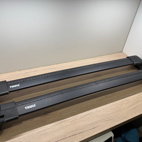 Thule kattotelineet, mustat. BMW 5-sarja E60 autoon sopivilla kiinnikkeillä. Hyväkuntoiset.