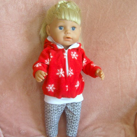 43 cm nukelle (baby born tai sister) tikkitrikoosta huppari, jossa edessä vetoketju ja hupun reunassa resori. Kukallisissa trikoohousuissa vyötäröllä kuminauha.