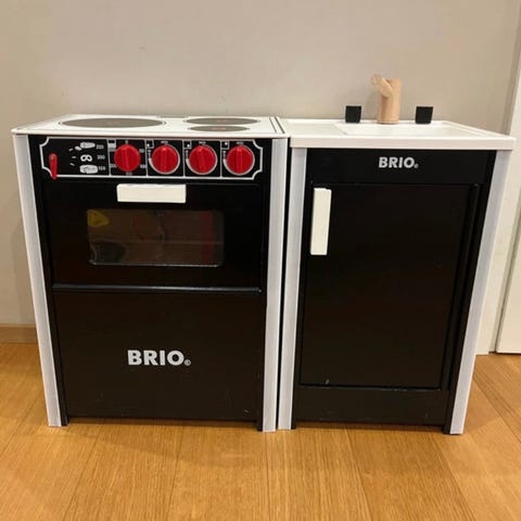 Pienen kokoinen leikkikeittiö. Nappia painamalla aika kulkee kellossa ja uuni piippaa "valmistumisen" merkiksi. Uunin luukussa ollut pleksi hävinnyt. Oikealla kaappi leikkitavaroille.