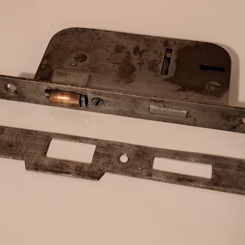 Myydään kuvissa oleva vanha siisti ja hyväkuntoinen kamarin oven pintalukko.