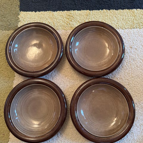 Lautaset ovat ok kunnossa, pitsissä tummentumaa, joka vaatii puhdistusta ja kahden lautasen reunassa käytön jälkiä ja kulumaa reunoissa.