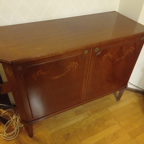 Suhteellisen hyvin pinnoiltaan säilynyt levysoitinkaappi. Kaunis muoto, alaspäin levenevä. Ovi avautuu ylöspäin, jonka voi kokonaan työntää sisään. Soittimen neulatanko on irti, näkyy kuvissa. Takana poikkaistu sähköjohto, joka näkyy kuvissa. Korkeus 55 cm, leveys 66 cm, syvyys ylhäällä 34 cm ja alaosassa 39 cm. Vain nouto.