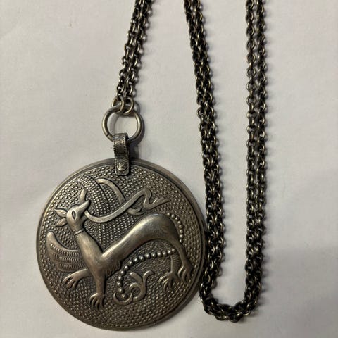 Kalevala Korun tuotannosta poistunut riipus. Korussa kivenä rodoniitti. Ketjun pituus on 64cm ja riipuksen halkaisija on 3,1cm.