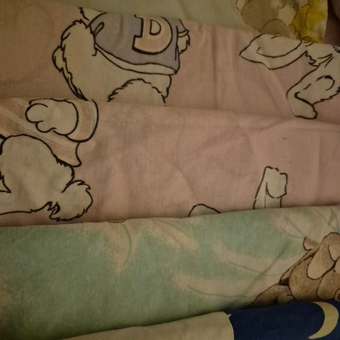 2 peittoa, valkoinen ja apinakuvioinen. Joitain pikkutahroja, en tiedä lähteekö irti pesussa.