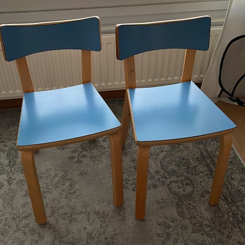 Myydään kaksi metallirunkoista vintage lastentuolia. Hinta yht. 50€/tarjous.