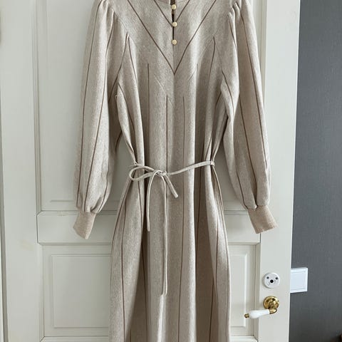 Upea Pääsky by Silon villasekoitemekko. Hyvä kunto ja kokoa suosittelen S/ pieni M(vyötärön kuminauha joustaa kyllä paljon mutta on lähtökohtaisesti hieman "tiukka"). Käännettävä kaulus jossa napit, vyö jonka kuulunee mennä kahdesti ympäri ja helmaosassa vuori. Noin pohjepituinen. Väri kauniin joulunpunainen, ei oranssi.