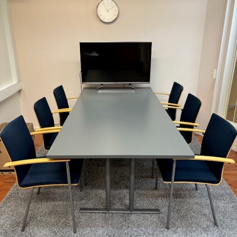 toimistopöytä ja kahdeksan tuolia vaaleaa puuta ja metallia