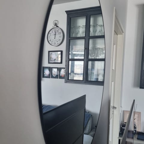 Myydään pyöreä peili, halkaisija 80 cm. Musta kehys.