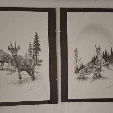 Sieniaiheiset taulut keltainen ja musta. Keltainen on oikein kirkkaankeltainen luonnossa. Kehystämössä kehystetty. Reunoissa pientä kulumaa kuvissa näkyen. Tekijä PK 2012. Hinta 15 e / kpl, yht. 25 e.