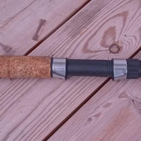 Hiilikuitu aihio 6mm ja rosteri haarukka kärjessä. Tuohesta kahva ja 4mm alumiinipuikko takahaarukkana. Päällä kutistesukka. Kehän väli 38cm eli keräyksellä siimaa liikkuu 76cm. Kokonaismitta vavalla 44cm. Paino kalastuskunnossa 68g.