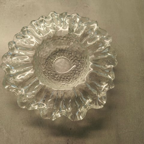 Pertti Santalahden suunnittelema Humppilan lasin Kasvimaalla-tarjoiluastia. Korkeus n.4 cm, halkaisija n.23 cm. Kirkasta lasia, kuin uusi. Vain nouto Tammistosta, Vantaalta. En postita. Maksu mobilepay tai käteinen. Myynnissä myös paljon muuta.