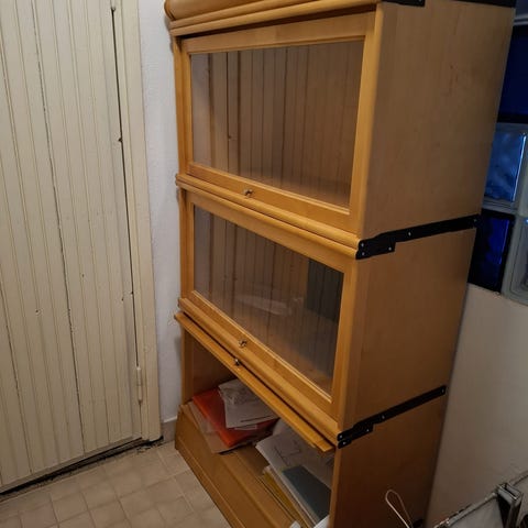 Kokonaisuus jossa kaksi lasiovista (toinen matala ja toinen korkea) ja yksi umpiovinen vitriini (korkea), umpisokkelilla. Hyväkuntoinen, lasit ehjät. Nouto Äänekoskelta.