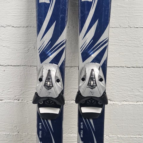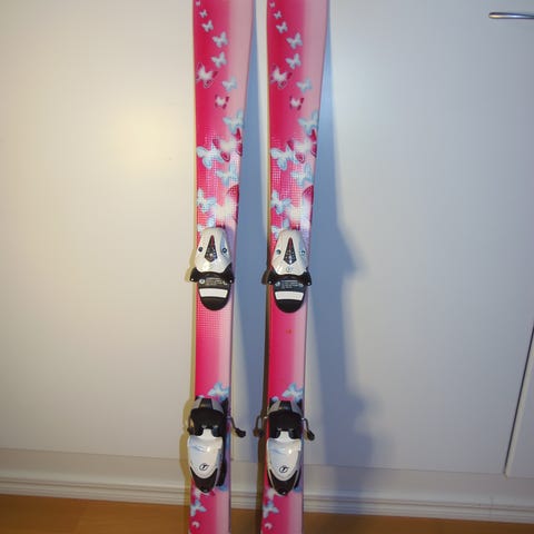 Lasten pinkit sukset, siteet Tyrolian. Toisessa suksessa yksi syvempi naarmu, joka näkyy kuvassa.