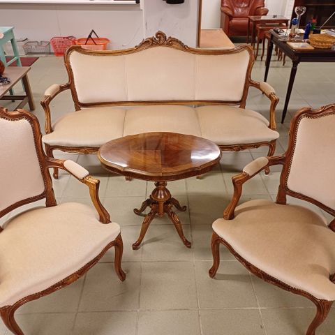 Näppärän kokoiset,käsinojalliset rokokootuolit sekä pyöreä kahvipöytä,hyväkuntoiset. Tuolien päälliset ehjät ,tosi siistit, ruskeaa kullanhohtoista samettia.