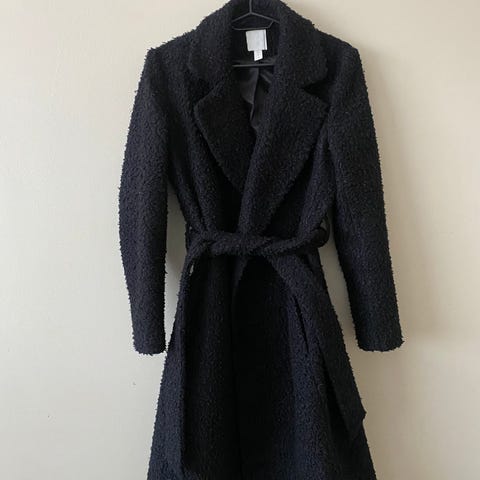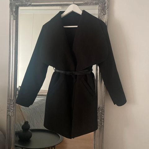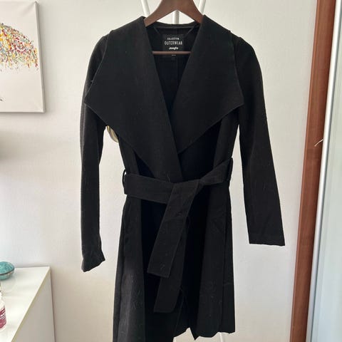 Musta naisten pitkä takki S-koko. Takissa on huppu ja sivutaskut. .