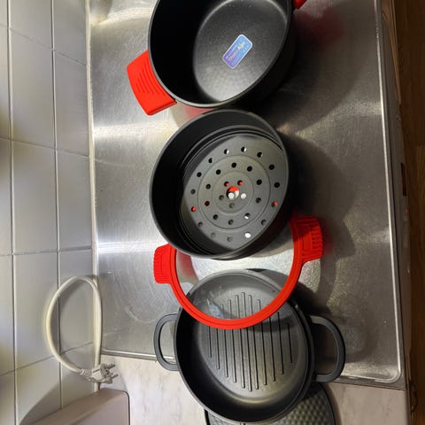 Tästä kuvassa näkyvät keittiötarvikkeet, 3 eri kokoista kattilaa ja paistinpannua, muutama lautanen ja eripari lasia ja mukia ym