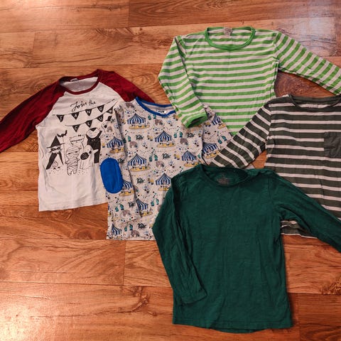 Paitapaketti, jossa seitsemän koon 110/116 paitaa.
