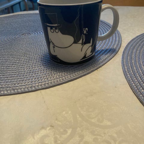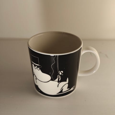 Arabia Muumi muki, jossa on värikäs raitakuosi ja Muumipappa Siesta. Ei tarraa. Pesty ja käyttämätön