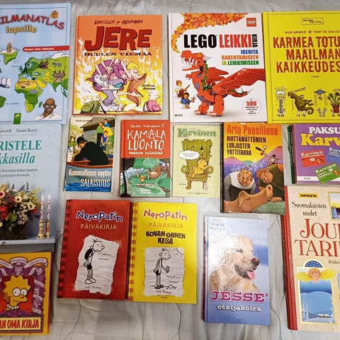 Kepler62 uusi maailma 5€, Wagnerin keksintökirja 2€, juoppohullun päiväkirja sekä myrkky vuodet 5€, Ella ja kaverit hevosen selässä 2€ ja baby blues herkku perhe 3€. Jos kaikki kirjat haluaa ne on 13€. Kirjat ovat aika hyvässä kunnossa saattaa olla jotain pieniä lika tahroja.