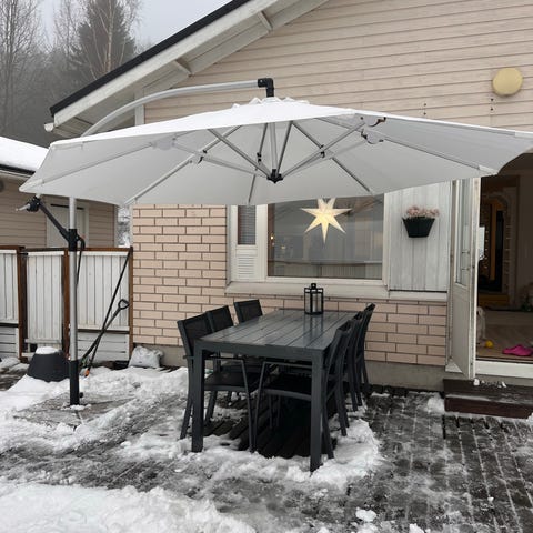 Kruunu Aurinkovarjo on kooltaan 3x3 metriä ja väriltään harmaa. Varjo on valmistettu Novasun-kankaasta, joka on kolmen vuoden takuu UV-suojauksella ja tarjoaa UPF 50+ suojan sekä vähintään 98 % UVA- ja UVB-säteilyltä. Varjo on suunniteltu käytettäväksi erilaisissa sääolosuhteissa ja on varustettu ympäristöystävällisellä kankaalla, joka on valmistettu kierrätetystä muovijätteestä. Varjon runko on anodisoitua alumiinia, joka on suojattu korroosiolta. Aurinkovarjo on helppo pitää puhtaana ja se on varustettu monipuolisilla säätömahdollisuuksilla. Sis. renkaat ja suojapussin. Käytössä ollut muutaman kuukauden.