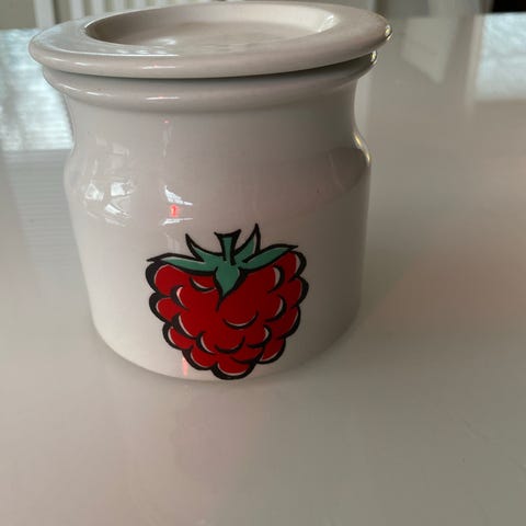 Arabia, Ulla Procopé, Tutti Frutti purkki, Vadelma kannella. Korkeus 6,2 cm, halkaisija 9,7 cm. Purkki on virheetön. Kannessa tummentumia (näkyvät kuvissa), jotka eivät lähde pesussa. Pohjassa kruunuleima.