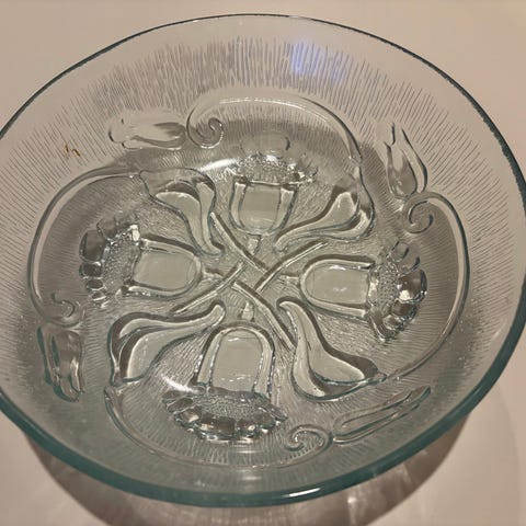 Lasilautanen, jossa kohokuvioitu kukkakuosi. Tarjoilulautanen tai koriste-esine, valmistettu kirkkaasta lasista. Halkaisija 35cm. Pieniä naarmuja lasissa käytön johdosta, muuten virheetön kunto