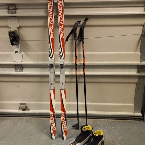 Venom Sport Step Grip 140 cm lasten pitopohjasukset NNN-siteillä + Fischer Sport Fibre-sauvat 100 cm + Snow Storm- monot , koko 34.