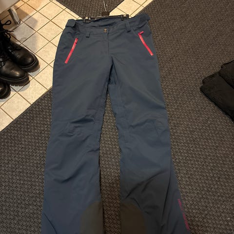 Annetaan Helly Hansenin toppahousut. Housuissa vettäpitävä kalvo. Housujen vasempaan lahkeeseen laskettelusuksen kantti leikannut ison reijän, joka paikattu nylonpaikalla. Muuten housujen kunto hyvä.