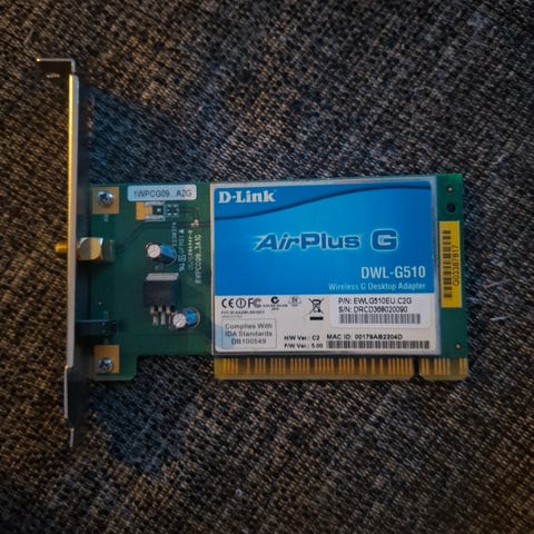 D-Link AirPlus G DWL-G510 langaton verkkokortti PCI-väylälle. Soveltuu pöytätietokoneisiin langattoman verkkoyhteyden luomiseen. Varustettu ulkoisella antennilla ja tukee G-standardin langatonta tiedonsiirtoa.