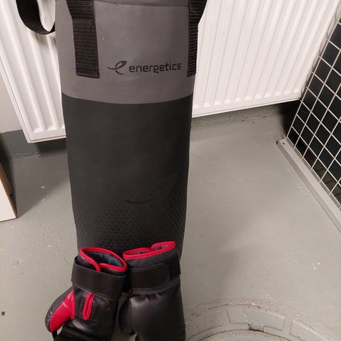 Nyrkkeilysäkki 5 kg. Korkeus 58 cm ja ripustuslenkkien pituus 35 cm. Saman sarjan hanskat. Vähän käytetyt. Maksu käteisellä tai Mobilepaylla.