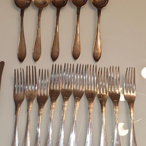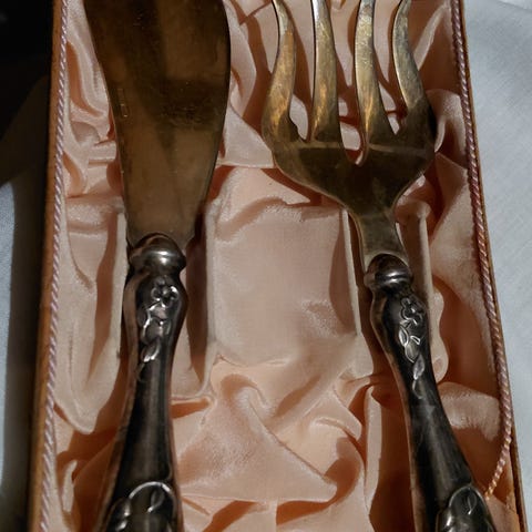 Vanhat kakkuottimet ruusukuvioiduilla kahvoilla. Materiaalina alpakka.
