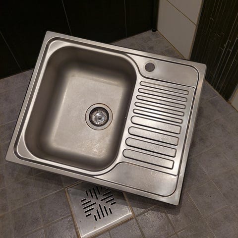 Teräksinen pyöreä tiskiallas ja Oraksen hana.