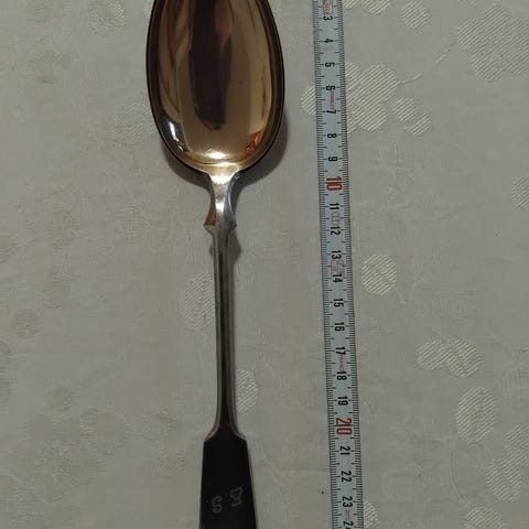 Musla -sarjan iso tarjoilulusikka. Pituus noin 25cm. Takana kaiverrus ks. kuva. Materiaali alpakka.