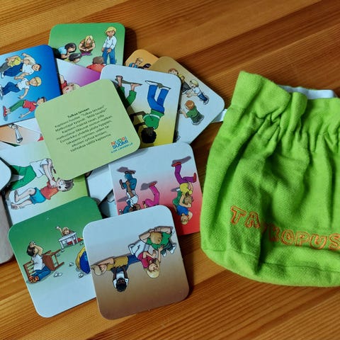 23 leikkikorttia lasten ryhmäleikkeihin näppärässä kangaspussissa. Siisti.