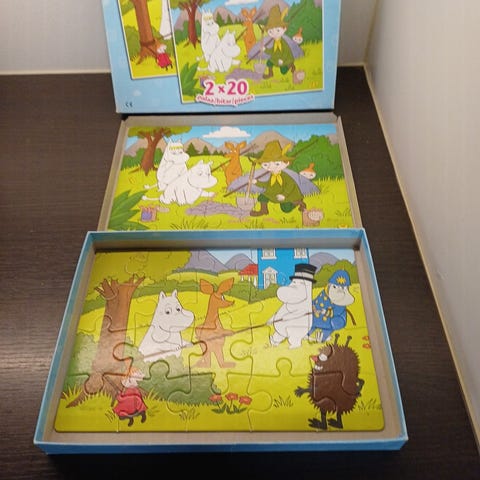 Muumit puinen palapeli, jossa on 20 palaa. Palapelin koko on 31 x 21 cm. Sopii 3-6-vuotiaille lapsille. Kunto hyvä.