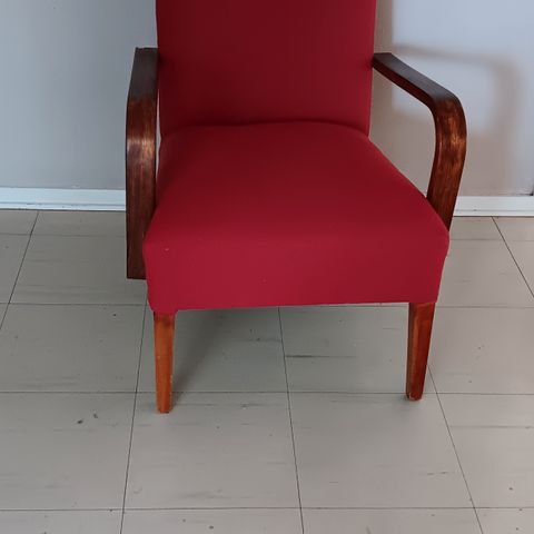 Uudelleen verhoilru nojatuoli 60- luvulta. Runko puuta,pehmusteet uusittu. Käsinojan puuosassa halkeama joka joskus liimattu. Kangas laadukas verhoilukangas,kuvio kukonaskel. Ei ole käytetty verhoilun jälkeen.
