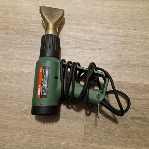 Tarpeettomaksi jäänyt uudenveroinen kuumailmapuhallin alkuperäisessä pakkauksessa.